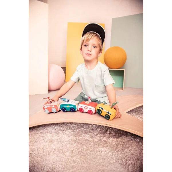 En roulant, la petite voiture ronronne joyeusement et l’oiseau Robin se réjouit. La voiture a la taille idéale pour les petites mains d’enfants. Il suffit de reculer la voiture, de la lâcher et elle démarre. Le départ est immédiat, on ne fait pas attendre les retardataires. Qui gagnera la course entre Joom, Marius, Alice et Stella ?
