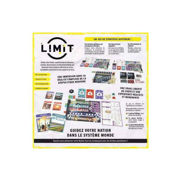 Limit est un jeu de stratégie compétitif dans lequel vous incarnez une Nation confrontée aux grands défis de notre monde. Prenez des décisions politiques cruciales, gérez vos ressources avec finesse, anticipez les crises mondiales et adaptez-vous aux bouleversements de la planète et aux choix des autres Nations.
