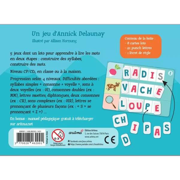 Les joueurs apprennent à composer des syllabes avec des jetons phonèmes (comprenant une à trois lettres), puis à composer des mots, en posant les jetons sur des grilles de loto où la décomposition du mot est indiquée.