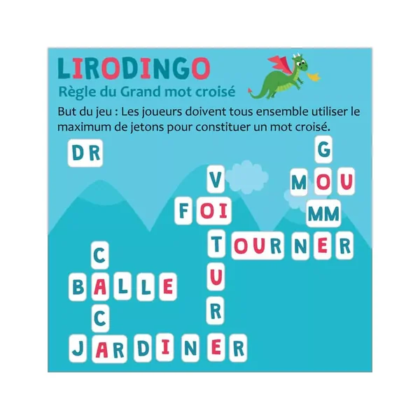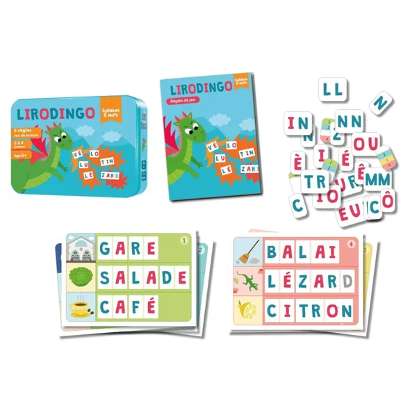 Lirodingo Syllabes et Mots est un jeu de société éducatif pour enfant jouable de 1 à 4 joueurs, dès 5 ans pour des parties de 10 minutes, édité par Aritma.