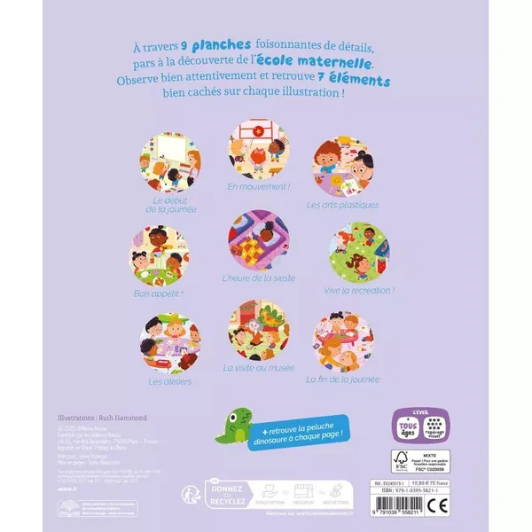 Chaque planche suit les grands moments de la journée à l’école maternelle : les ateliers, le sport, la cantine, la sieste, la récréation, la garderie… Les tout-petits observent attentivement les illustrations et retrouvent 7 éléments (+ une mascotte) bien cachés ! FAQ
