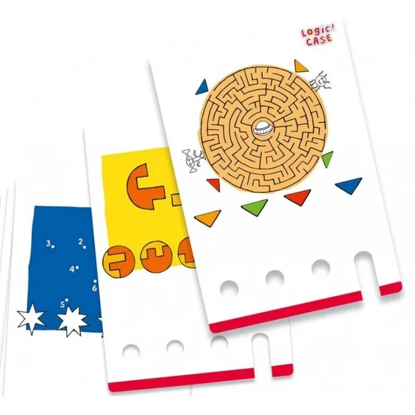 Logic Case, ce sont 77 énigmes à résoudre. Regarde la carte, une grande illustration se trouve au milieu, en bas il y a quatre illustrations plus petites. À toi de trouver quelle petite illustration correspond à la grande. Pour vérifier, enfonce le stylet dans le trou correspondant. Si tu parviens à retirer facilement la carte, c’était la bonne réponse ! Sinon, dommage, tu t’es trompé.