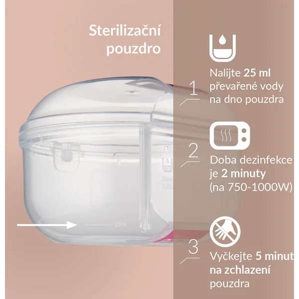 AVERTISSEMENT ! Le non-respect de cette instruction peut entraîner des brûlures ou des dommages au produit et/ou au micro-ondes. Avant utilisation, vérifiez toujours le niveau d’eau dans l’étui de désinfection. Il est possible de désinfecter deux tétines à la fois dans l’étui. Ce produit n’est pas un jouet. Utilisez et conservez le produit hors de portée des enfants.