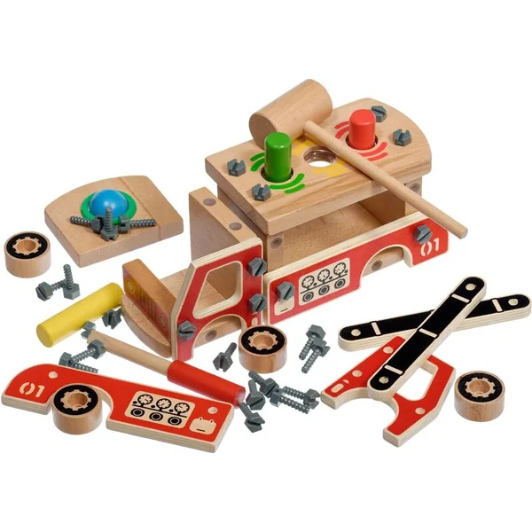 - L’emballage contient 17 pièces en bois pour assembler la voiture, beaucoup de vis, 1 tournevis, 3 chevilles colorées et 1 boule à enfoncer ainsi qu’un marteau.