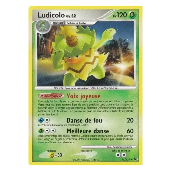 Découvrez Ludicolo (pl034), une carte Pokémon de l’extension Platine, provenant du bloc Platine. Idéale pour compléter votre collection, cette carte Rare plaira autant aux collectionneurs qu’aux joueurs.