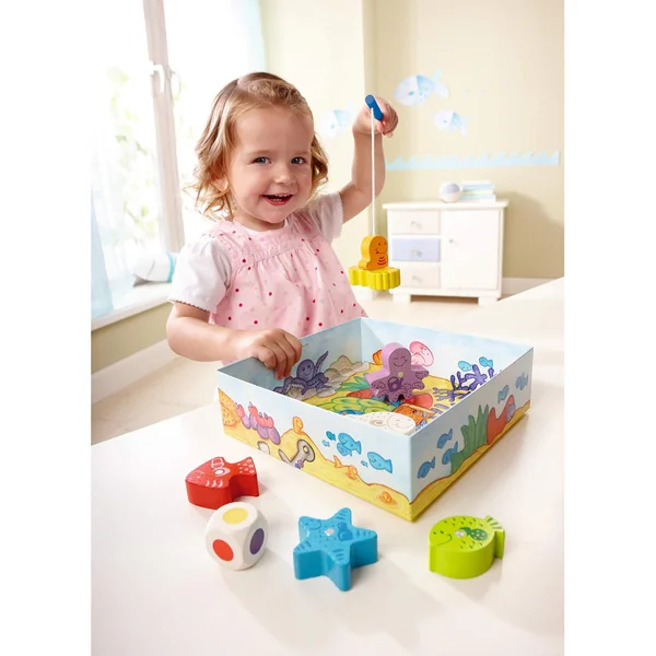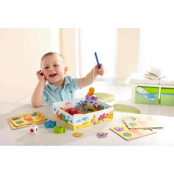 Dans le jeu libre, les enfants jouent avec la canne à pêche, la mer et les amusants animaux aquatiques. Dans le jeu à règles, les enfants doivent pêcher un poisson correspondant à la couleur du dé. Si la pêche est bonne, le joueur récupère un jouet qu’il pose dans la découpe correspondante de la plaquette du joueur.