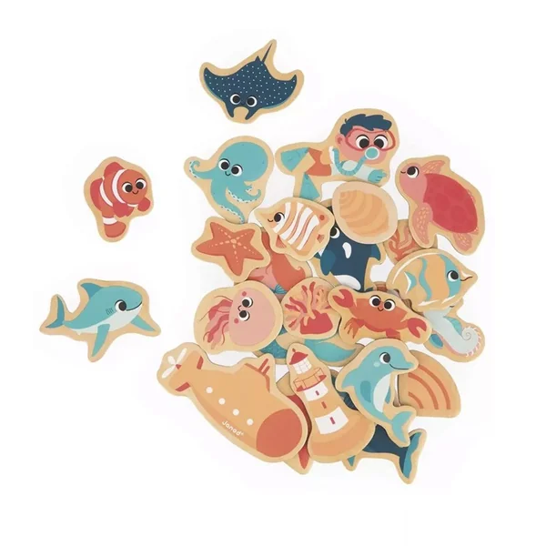 Donnez un look aquatique à toutes les surfaces magnétiques avec ce set de 24 magnets en bois ! Ces magnets monde marin trouvent leur place sur le réfrigérateur ou sur le tableau des petits, pour des créations qui font rêver. Des créatures marines fantastiques, des coquillages, et même un sous-marin font partie de ce lot d’aimants pour enfants. On trouve aussi un phare, des coraux, un plongeur et une sirène ! Les aimants sont de différentes tailles pour faciliter leur préhension. Idéals pour compléter un tableau magnétique, ces aimants sur le thème de l’océan donnent vie aux histoires des petits qui stimulent ainsi leur imagination et leur vocabulaire. La manipulation des magnets est aussi un bon moyen de développer la motricité fine des enfants.