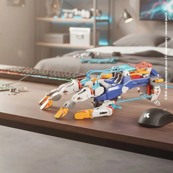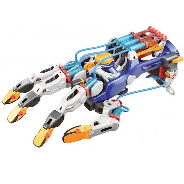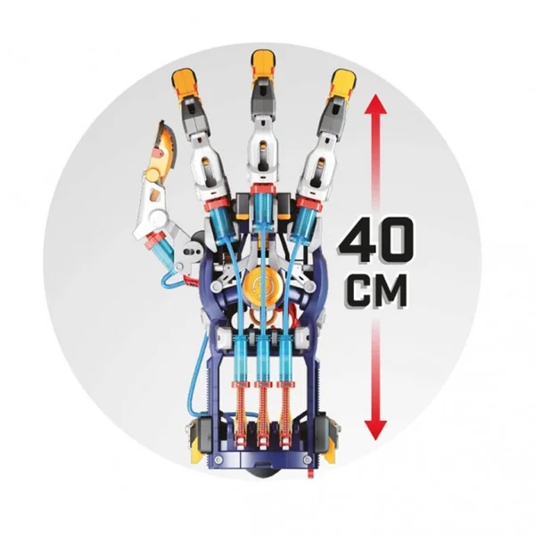 Construis une main cyborg articulée en assemblant les pièces. Ajoute de l’eau dans le système et pilote-la du bout des doigts.