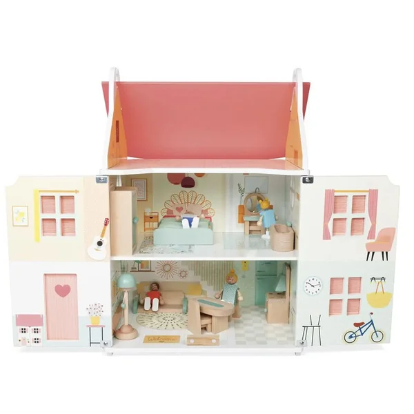 Voici une jolie maison de poupées sur 3 étages au toit couleur corail et aux illustrations printanières !