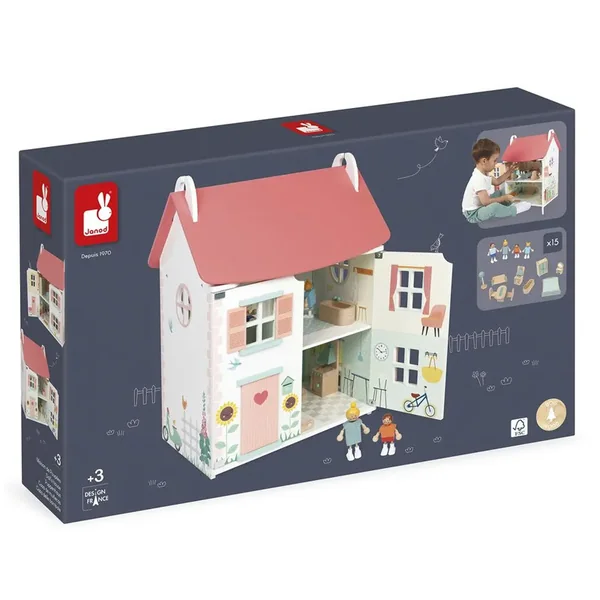 En ouvrant les grandes portes magnétiques, on découvre une maison de poupées pleine de charme et de détails ! On retrouve les différentes pièces de la maison : un salon, une cuisine, une salle de bain… Mais où est le lit ? Pas de panique, il se trouve au 3e étage ! Pour l’apercevoir, il suffit de retirer le toit ! Malin, ce dernier est amovible pour faciliter l’accès à l’étage supérieur ! Les briques corail, les oiseaux et les arbustes créent un univers vivant où les enfants pourront inventer mille histoires.