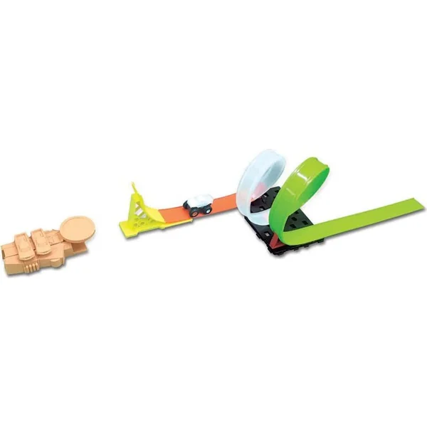 Un circuit de course coloré avec deux boucles et une rampe qui propulse la voiture en l’air.