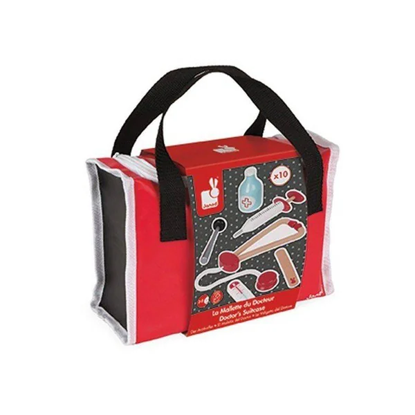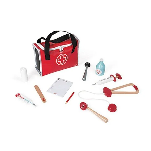 Contenu : 10 accessoires en bois : une seringue équipée d’un ressort intérieur, un marteau pour les réflexes, une bouteille de désinfectant, un stéthoscope, un otoscope équipé d’une loupe, un thermomètre, une languette, un calepin d’ordonnance et un rouleau de bandage.