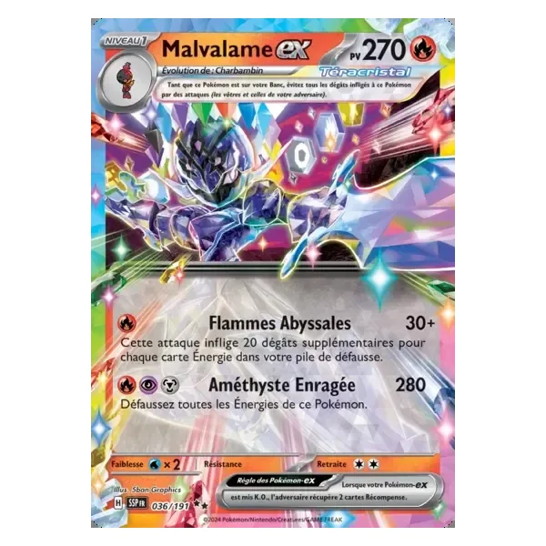 Découvrez Malvalame (ssp036), une carte Pokémon de l’extension Étincelles Déferlantes, provenant du bloc Écarlate & Violet. Idéale pour compléter votre collection, cette carte Double Rare plaira autant aux collectionneurs qu’aux joueurs.