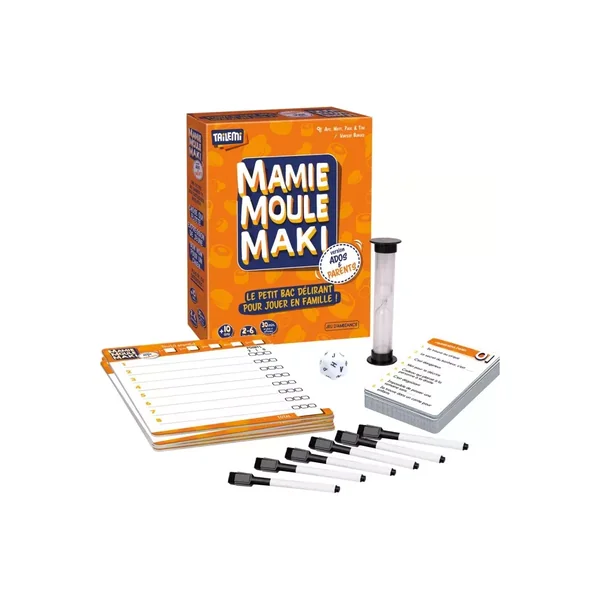 Mamie Moule Maki Ados & Parents est un jeu de société d’ambiance jouable de 2 à 6 joueurs, dès 10 ans pour des parties de 30 minutes, édité par Gigamic.
