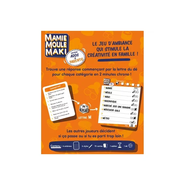 Mamie Moule Maki version Ados & Parents est un jeu simple, accessible, et idéal pour animer une soirée en famille. Il favorise l’échange, la créativité, et l’humour, sans jamais devenir trop complexe.