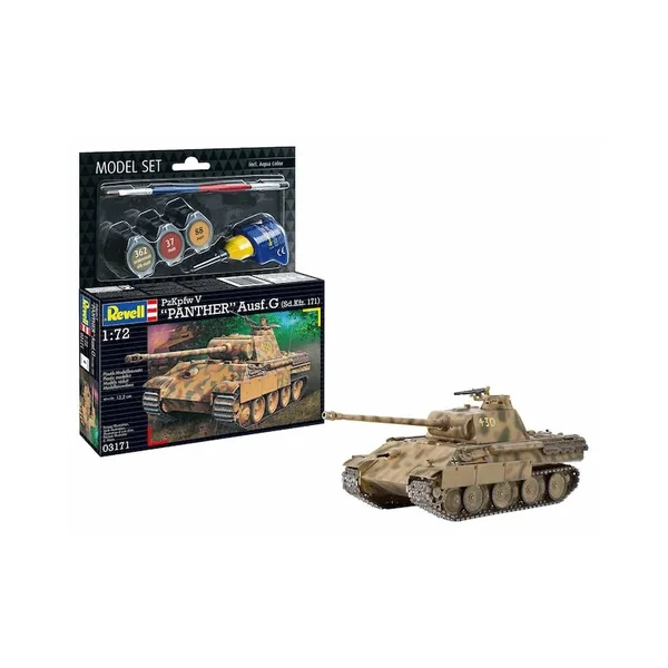 La version G était la variante la plus produite du Pzkpfw V Panther et a remplacé la version A en production à partir de 1944. Le châssis avait été conçu pour être plus abordable et d’autres améliorations étaient continuellement incorporées dans la production. Les véhicules de la version finale avaient, entre autres, un pont moteur modifié et un couvercle de rouleau de forme modifiée. Avec son canon de char de 7,5 cm 42L/70 et ses formes pare-balles, le Panther s’est avéré être un adversaire dangereux. Le moteur essence V-12 cylindres Maybach HL 230P30 d’une puissance maximale de 700 ch a permis à la Panther Ausf. G de 44 800 kg d’atteindre une vitesse de pointe allant jusqu’à 55 km/h. L’équipage était composé de cinq hommes. En plus des peintures de base, de la colle et des pinceaux sont également inclus.