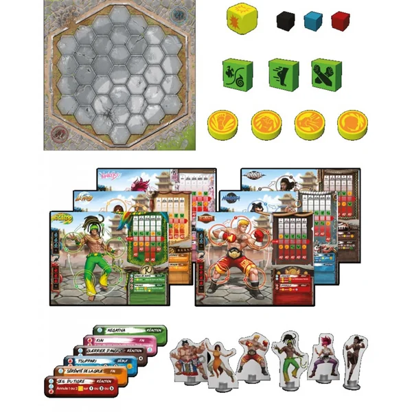 À leur tour, les joueurs choisiront l’une des cinq zones de leur tableau de combat personnel et utiliseront les jetons qui s’y trouvent. Ils pourront frapper leurs adversaires avec des jetons d’action, mais ils devront également utiliser leurs jetons d’effet pour contrôler leurs positions sur la zone de combat, générer de l’énergie pour déclencher de puissantes compétences spéciales et préparer leur défense pour les prochains tours.