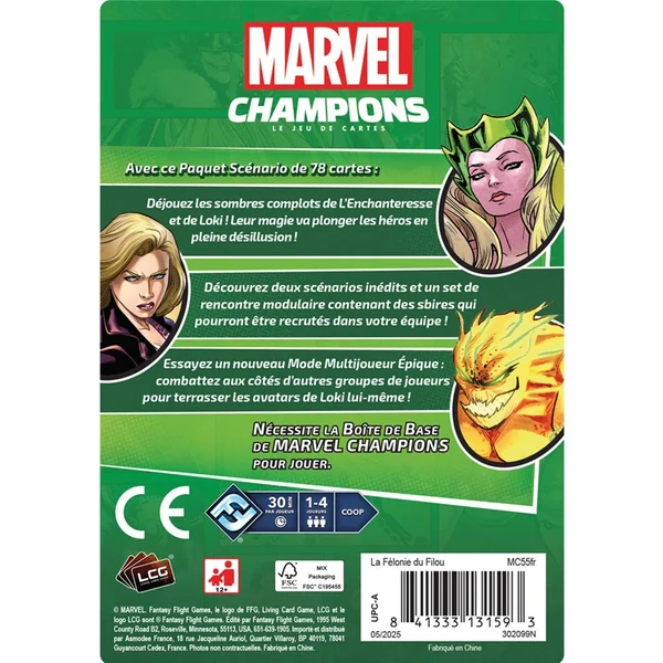 Le paquet Scénario La Félonie du Filou est une extension palpitante pour Marvel Champions : le Jeu de Cartes. Il contient deux scénarios (Enchanteresse ; Dieu des Mensonges) et un set de rencontre modulaire. Le scénario Dieu des Mensonges propose un Mode Multijoueur Épique permettant à n’importe quel nombre de joueurs de combattre Loki, le Dieu des Mensonges !