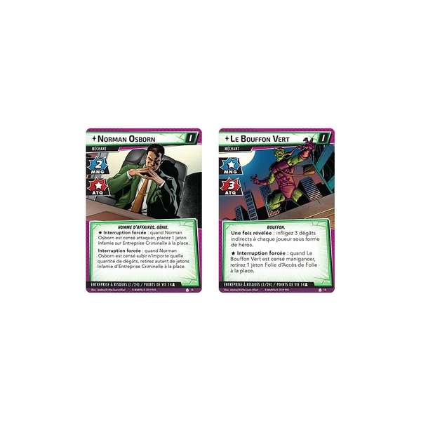 Ce paquet de 78 cartes propose deux nouveaux scénarios impliquant le perfide Norman Osborn et son alter ego sadique, le Bouffon Vert. Il contient également quatre sets de rencontre modulaires que vous pourrez mélanger à ces scénarios afin de personnaliser votre expérience de jeu !