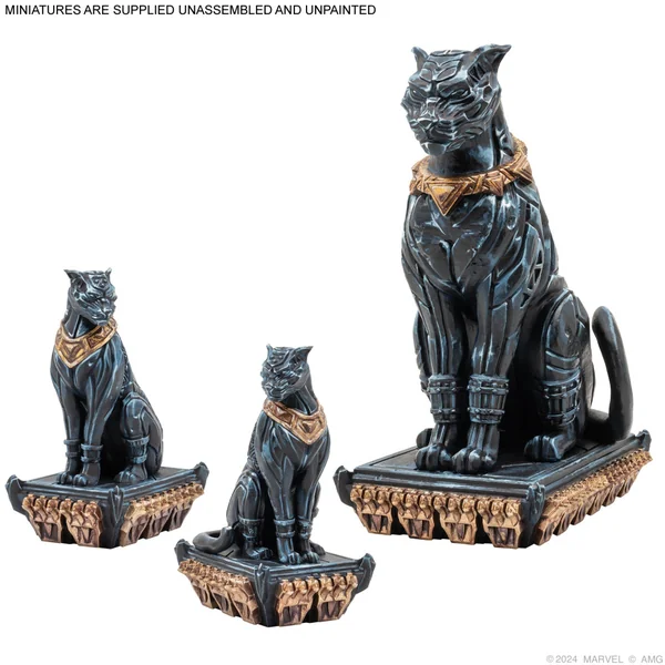 De grandes statues de panthères honorant Bast et la lignée royale du Wakanda sont érigées partout dans cette fière nation, et ce paquet apporte une variété de ces statues sur le plateau de jeu.