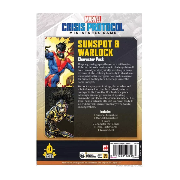 Marvel Crisis Protocol : Sunspot & Warlock – Character Pack est une extension pour 2 joueurs dès ans pour des parties d’environ minutes, édité par Atomic Mass Games.