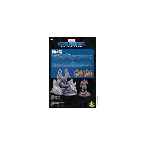Ce pack d’extension fournit aux joueurs tout ce dont ils ont besoin pour ajouter Thanos, le Titan Fou, à leurs parties de Marvel : Crisis Protocol. Ce pack d’extension introduit également les règles d’un nouveau mode de jeu multijoueur : Ultimate Encounters. Dans Ultimate Encounter : Infinity Gauntlet, deux joueurs font équipe dans un dernier pari désespéré pour tenter de vaincre le dieu Thanos avant qu’il ne puisse utiliser les six pierres d’inffinité pour réaliser sa folle vision de l’univers.