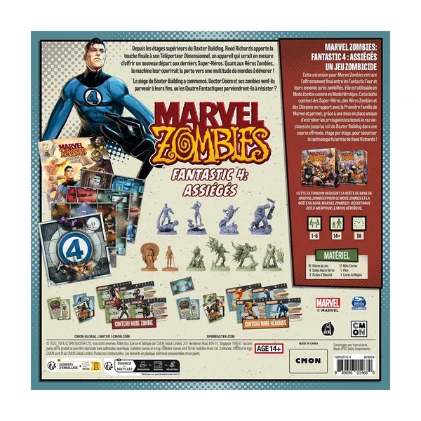 Marvel Zombies : Fantastic 4 : Assiégés est une extension pour Marvel Zombies, de 1 à 6 joueurs, pour des parties de 60 minutes environ, édité par CMON.
