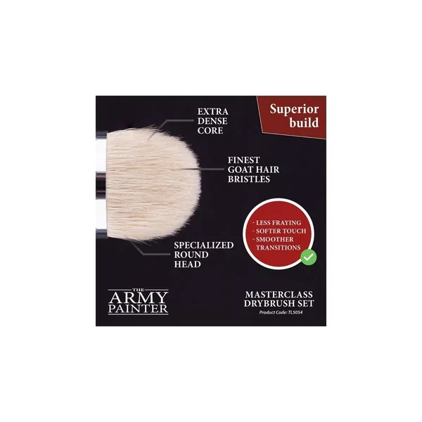 Le Kit de Pinceaux Masterclass Drybrush Set de Army Painter contient 3 pinceaux différents avec une pointe en forme de dôme de haute qualité. Les poils de chèvre doux combinés à la forme arrondie du dôme permettent un toucher très doux même avec un brossage à sec rugueux, vous donnant un résultat subtil et raffiné. Chaque pinceau possède une poignée ronde complète pour permettre une prise en main confortable lorsque vous effectuez de larges coups sur vos modèles préférés.