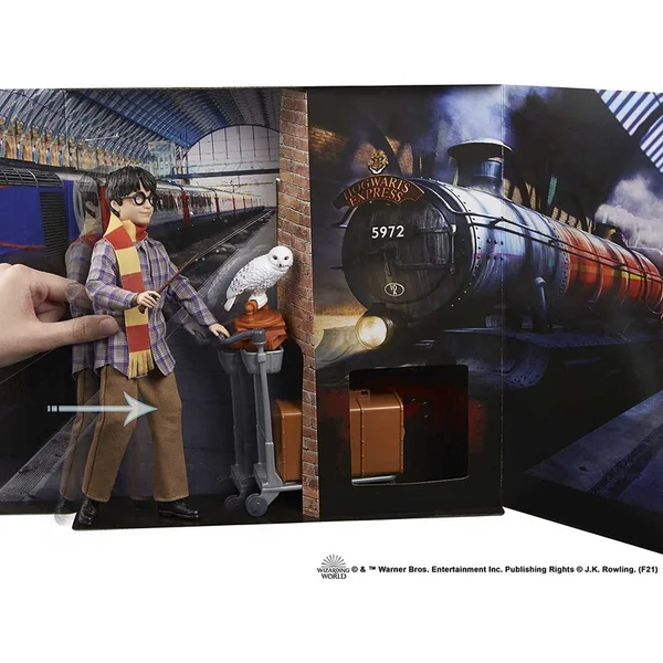 - Rappelle-toi avec cette poupée l’embarquement dans le train soudain pour Poudlard, qui part au début de l’année scolaire de la plateforme 9¾ à la gare King’s Cross à Londres.