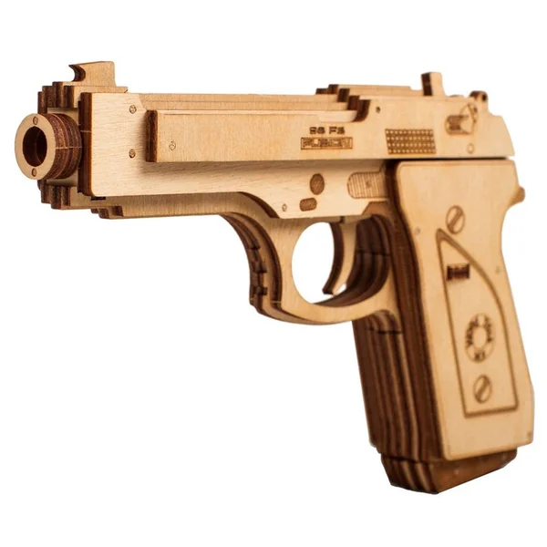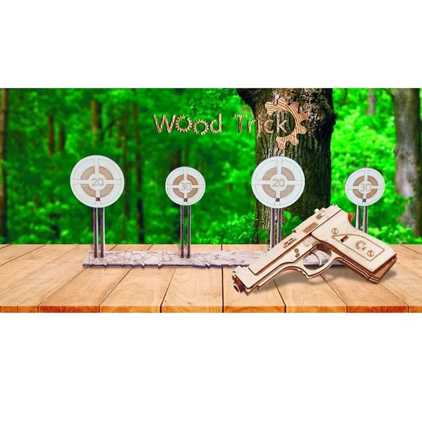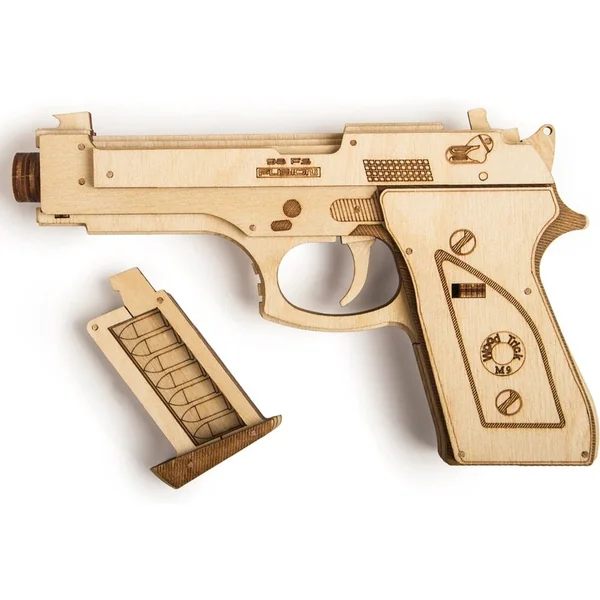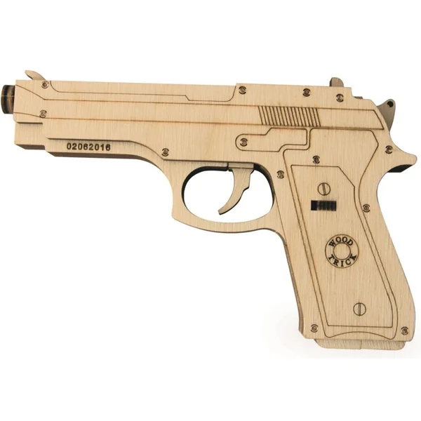 Les pièces pour le pistolet sont incluses dans le kit de montage. Une bande élastique est utilisée dans le mécanisme de déclenchement de l’arme à feu. De plus, un clip de munitions est inclus. C’est simple : il suffit de charger l’arme, de viser, puis d’appuyer sur la gâchette pour faire voler la balle en bois ! Les projectiles partent de la bouche de l’arme et peuvent parcourir une distance de plusieurs mètres avant d’atteindre leur cible assez précisément.