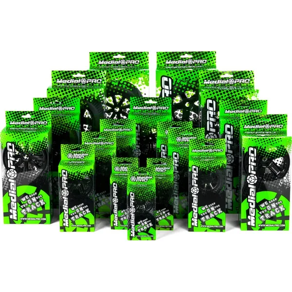Roues complètes Medial Pro 2.8″ Dirt Crusher avec jante Addict pour modèles réduits de voitures RC. La jante est de couleur noire, la dureté du mélange de pneus est douce.