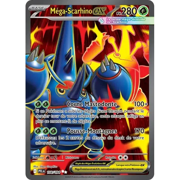 Découvrez Mega Scarhino (pfl108), une carte Pokémon de l’extension Flammes Fantasmagoriques, provenant du bloc Méga-Évolution. Idéale pour compléter votre collection, cette carte Ultra Rare plaira autant aux collectionneurs qu’aux joueurs.