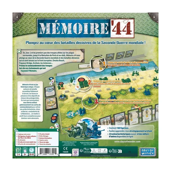 Mémoire 44 – Nouvelle Édition contient : 1 plateau de champ de bataille à deux faces, 44 pièces hexagonales de terrain double face, 144 figurines d’armée Alliés/Axe, 36 obstacles, 2 porte-cartes, 1 paquet de 82 cartes, 8 dés spéciaux, 6 jetons « activation », 1 livret de règles et un livret de scénarios.