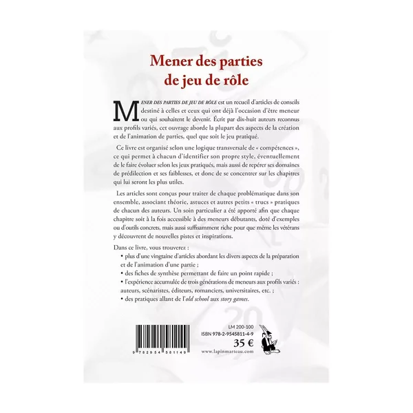 Un soin particulier a été apporté afin que chaque chapitre soit à la fois accessible à des meneurs débutants, doté d’exemples ou d’outils concrets, mais aussi suffisamment riche pour que même les vétérans y découvrent de nouvelles pistes et inspirations.