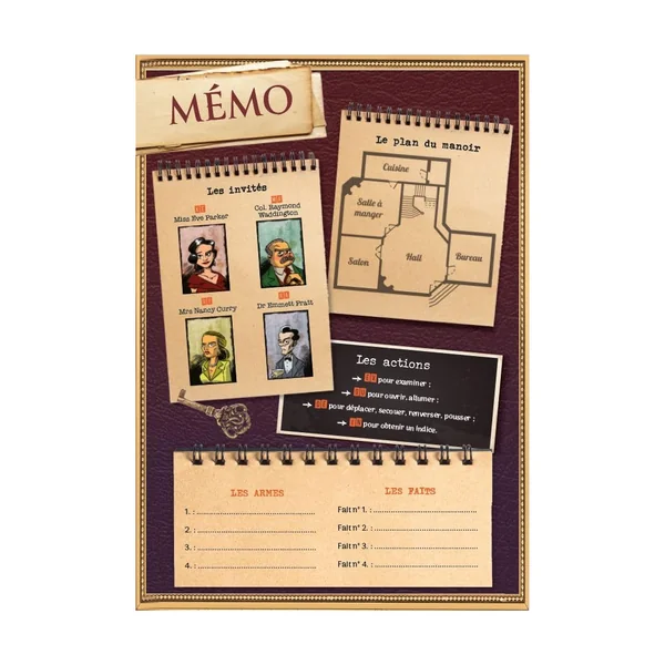 - 1 memo pour garder en tête le plan du manoir, les suspects, les actions possibles, etc.
