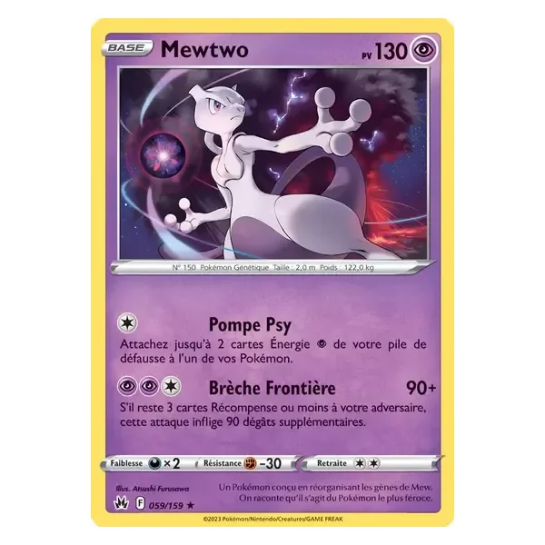 Découvrez Mewtwo (crz059), une carte Pokémon de l’extension Zénith Suprême, provenant du bloc Épée & Bouclier. Idéale pour compléter votre collection, cette carte Holo Rare plaira autant aux collectionneurs qu’aux joueurs.