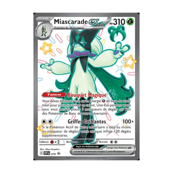 Découvrez Miascarade (svp078), une carte Pokémon de l’extension Promos Écarlate a Violet, provenant du bloc Écarlate & Violet. Idéale pour compléter votre collection, cette carte Promo plaira autant aux collectionneurs qu’aux joueurs.