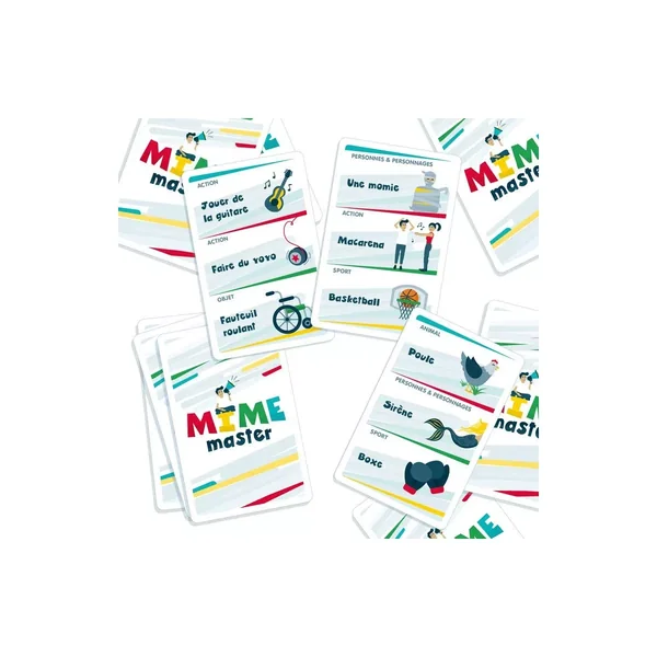 Le Mime Master pioche une carte, qu’il va devoir faire mimer aux autres joueurs : sans donner la réponse, et en ne donnant que des ordres indiquant des positions, des mouvements, etc…