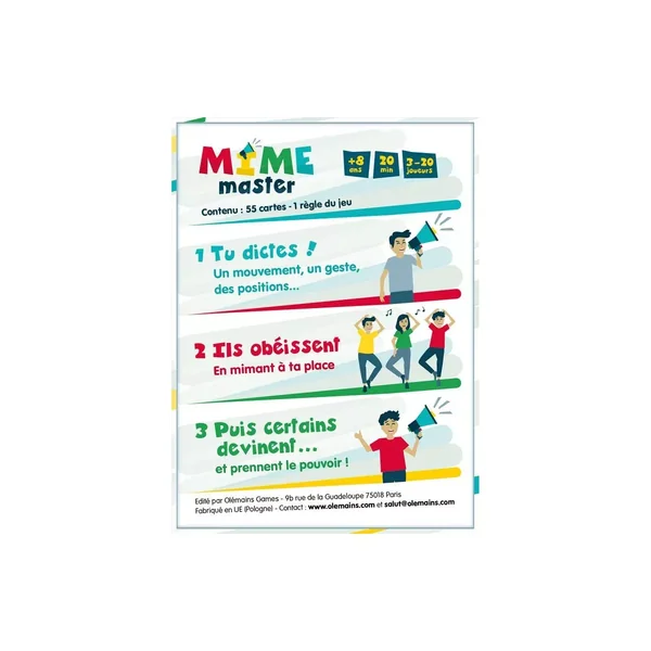 Mime Master est un jeu de société d’ambiance jouable de 3 à 20 joueurs, dès 8 ans pour des parties d’environ 20 minutes, édité par KYHU.