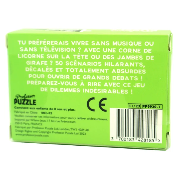 Tu préfèrerais vivre sans musique ou sans télévision ? Avec une corne de licorne sur la tête ou des jambes de girafe ? 50 scénarios hilarants, décalés et totalement absurdes pour ouvrir de grands débats ! Préparez-vous à rire avec ce jeu de dilemes indésirables !