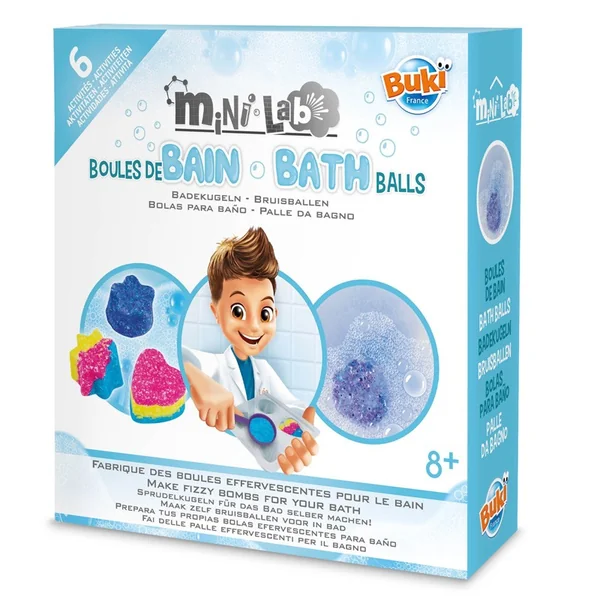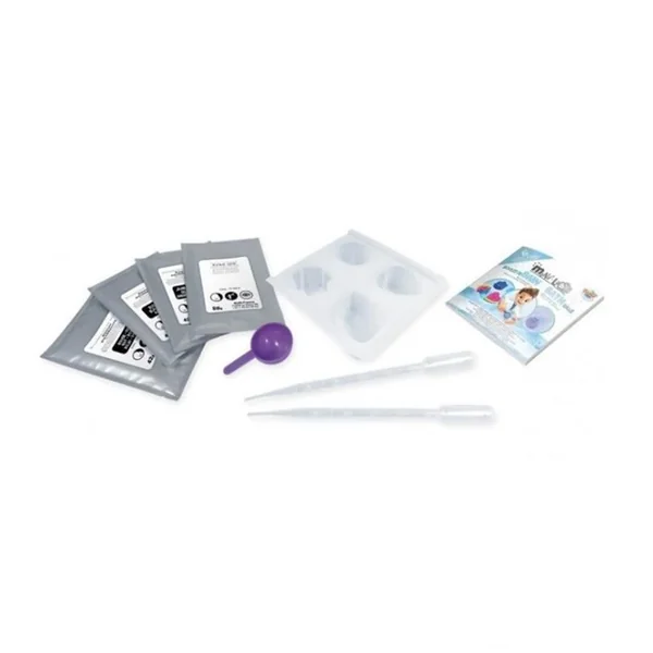 Avertissements : Les poudres sont à utiliser exclusivement dans le cadre des activités de ce coffret. Ne pas ingérer. Ne pas laisser à la portée des jeunes enfants. Le coffret nécessite de la fécule de maïs (environ 20g par boule) et de l’huile d’olive non fournies.