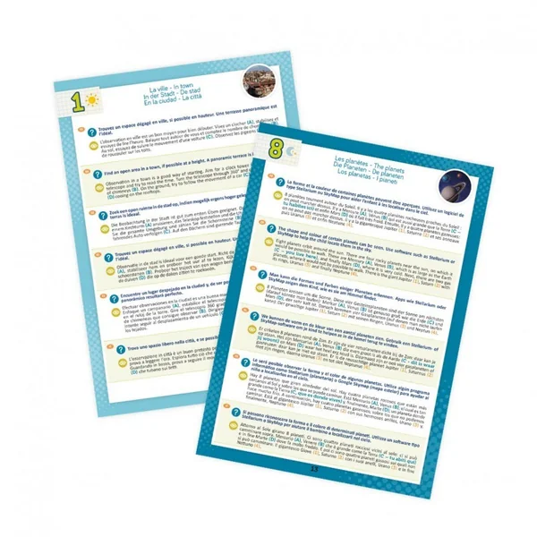 Contient des accessoires adaptés aux plus petits: un télescope binoculaire grossissement X15, diamètre 35mm et un trépied de 30 cm.