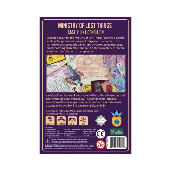 Explorez un monde parallèle rempli de trésors oubliés et de souvenirs égarés dans cette aventure narrative et ludique. Découvrez des messages secrets, rencontrez des personnages attachants et résolvez un mystère tactile pour réunir un objet perdu et son propriétaire. Lint Condition propose quatre chapitres de jeu d’énigmes magnifiquement illustrés et empreints de douceur. Plongez dans une boîte remplie de lettres, cartes, documents et témoignages, accompagnés de quelques objets et d’une multitude de babioles.