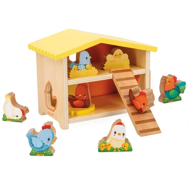 On entend au loin le chant du coq ! Le jour se lève à la ferme et bébé va pouvoir profiter de son poulailler en bois pour donner le ton de cette journée, dès 18 mois.
