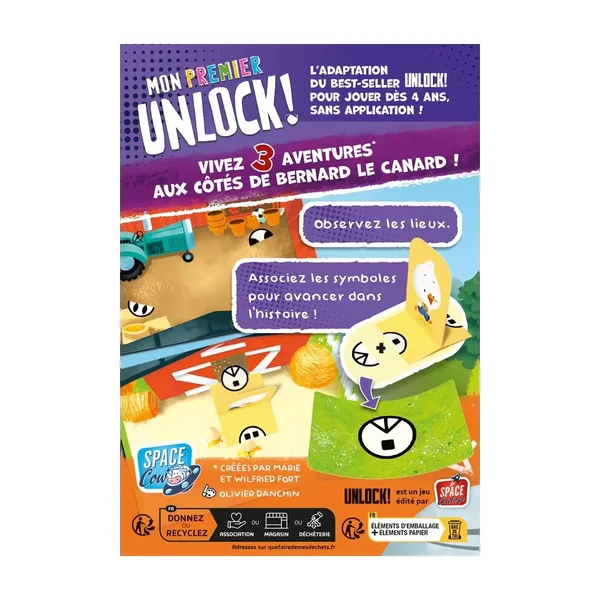Mon Premier Unlock : Histoires de Canard est un jeu de société pour les enfants jouable de 1 à 4 joueurs, dès 4 ans pour des parties de 15 minutes, édité par Space Cow.