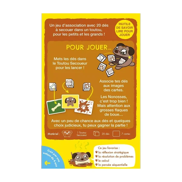 Chaque face correspond à une action, la face « Toutou Crado » vous permet de donner votre dé à un adversaire. La face blanche vous force à reprendre votre dé. La face os vous permet d’enterrer votre dé sur la carte os (à l’abri, ouf !). Et la face boue vous fait stocker votre dé sur la carte boue… mais attention !