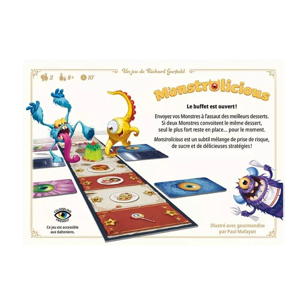 Monstrolicious est un jeu de bluff et de contrôle de bornes pour 2 joueurs, dès 7 ans pour des parties de 10 minutes environ, édité par Repos Production.