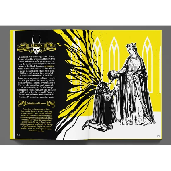 - Un bref aperçu de ce monde qui se meurt. De la cathédrale gothique des Basiliques à deux têtes à Galgenbeck et du palais de la comtesse Anthelia, aux champs de la mort à Graven-Tosk et aux déchets stériles de Kergüs.