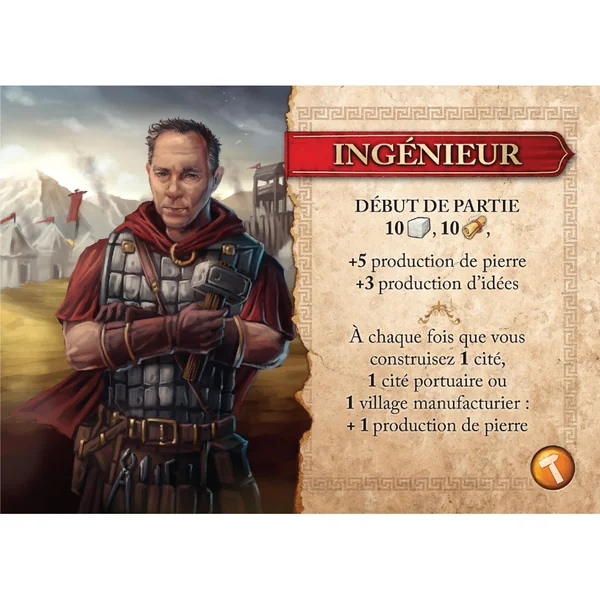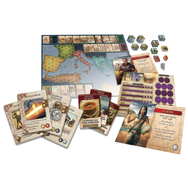 - Les sets d’extension 1 à 4 : pièces en métal, jetons en bois, figurines de merveilles en plastique, figurines de villes/projets/ports en plastique et figurines d’unités militaires en plastique