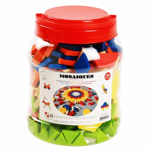 Un jeu de patience et d?adresse pour créer de superbes rosaces ou composer des figures imaginaires. Six formes géométriques de six couleurs pour initier l?enfant aux notions de formes et d?angles : 1 triangle, 2 losanges, 1 trapèze, 1 hexagone, 1 carré. En milieu scolaire, ce jeu est utilisé pour développer les notions de calcul de surface, fraction, symétrie par réflexion, rotation et translation…